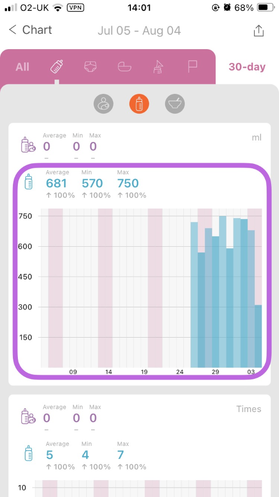 赤ちゃんの成長に熱心なママは生まれる前から始めているかもしれませんが、私はこの時期から使い始めました。私のお勧めはBaby Tracker (App Store – Apple)。他のいくつかの同類のアプリと比較しましたが、私はこれが使いやすかったのと、サブスクリプションタイプ(月会費を払う)ではなく、ワンオフ(アプリを一回のお会計で買う)タイプなのも良かったです。私が特に便利と思っている機能を以下に挙げます。(私独自の使い方をしている部分もあります。例えば、尿はカウントせず便だけしているなど。紫のキャプションをスクロールして頂くことで、画像の全体を見ることが出来ます。)